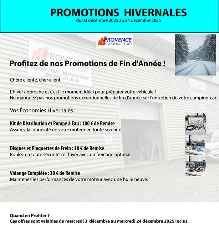 Spécialisé dans l'entretien et la réparation de camping-cars depuis plus de 20 ans, nous vous proposons un service complet : carrosserie (réparation pare-choc, peinture...), mécanique (vidange, distribution...), pose d'accessoires (panneaux solaires, climatisation...) et bien plus encore.